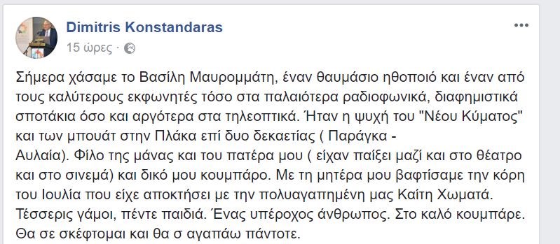 Την είδηση του θανάτου του έκανε γνωστή ο δημοσιογράφος Δημήτρης Κωνσταντάρας, από το προφίλ του στο facebook.