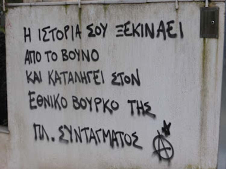 Η ανάρτηση συνοδεύεται και με σχετικές φωτογραφίες, ενώ το κείμενο αναφέρει μεταξύ άλλων ότι: «Σήμερα το μεσημέρι μερικές συντρόφισσες και σύντροφοι παρεμβήκαμε στο σπίτι του Μίκη Θεοδωράκη, γράφοντας στην πρόσοψη: “Η ιστορία σου ξεκινάει από το βουνό και καταλήγει στον εθνικό βούρκο της πλατείας Συντάγματος”. Στη συνέχεια πετάξαμε μπογιές και αποχωρήσαμε.