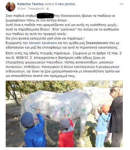 “Πρόκειται για ένα σχολείο που έχει εντάξει στο πρόγραμμα του συχνές επισκέψεις και φροντίδα των ζώων, είχε σκυλάκι στην αυλή του και πάντα μιλάει στα παιδιά για την αγάπη προς τα ζώα. Τα παιδιά πάντα βλέπουν την ζωγραφική σαν πράξη αγάπης : βάφουν τον εαυτό τους, τους άλλους και τρελαίνονται για face painting. Κανείς δεν λέει στις κοπέλες που βάφουν ότι κακοποιούν τα παιδιά. Το άλογο δεν πόνεσε και δεν ταλαιπωρήθηκε. Ακόμη και αν κάποιος διαφωνεί με την δράση ας μείνει σε αυτό ας σχολιάσει … Γιατί χαρακτηρίζετε τους εκπαιδευτικούς και το σχολείο συνολικά με τέτοιο τρόπο; Με τρόπο που θα μπορούσαν να σας ρωτήσουν: τέτοια μαθαίνεται στα παιδιά σας;; Να βρίζουν και να αφορίζουν ;;; Ψυχραιμία” Λ.Δ.