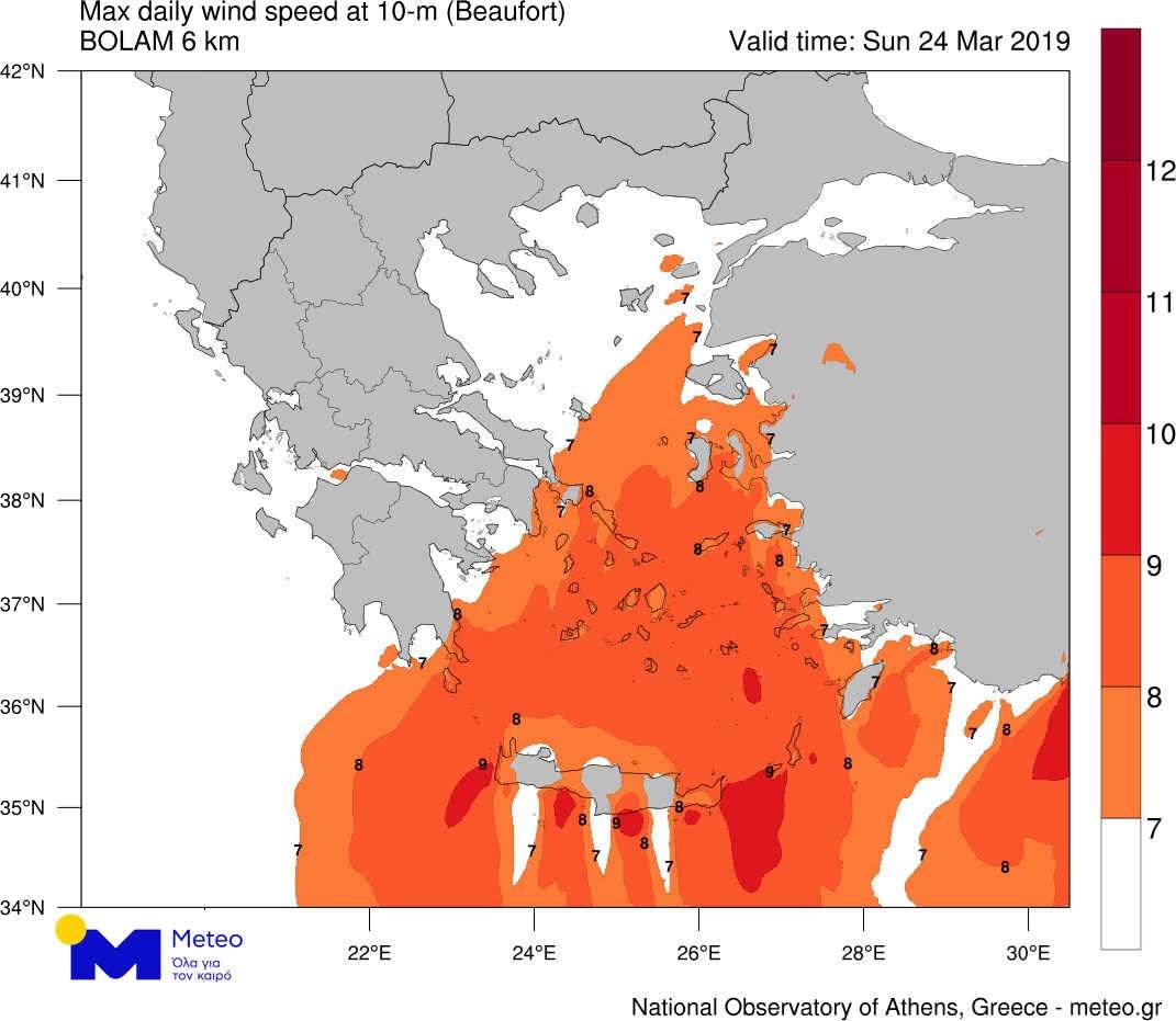 Η θερμοκρασία δεν θα παρουσιάσει μεταβολή, ενώ οι βόρειοι άνεμοι στο Αιγαίο θα ενισχυθούν και θα φτάνουν τοπικά τα 9 μποφόρ, όπως φαίνεται και στον Χάρτη 1.