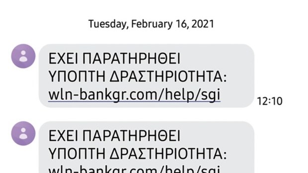 Στην προκείμενη περίπτωση την 16η Φεβρουαρίου 2021 και ώρα 12.10 μ. η ελεύθερη επαγγελματίας έλαβε ένα μήνυμα στο κινητό τηλέφωνο της από τον φερόμενο ως WINBANK.GR αποστολέα που ανέφερε αυτολεξεί τα εξής:“ΕΧΕΙ ΠΑΡΑΤΗΡΗΘΕΙ ΥΠΟΠΤΗ ΔΡΑΣΤΗΡΙΟΤΗΤΑ: win-bankgr.com/help/sgi”.