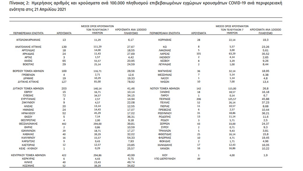 Σύμφωνα με τα όσα ανακοίνωσε ο ΕΟΔΥ το απόγευμα της Τετάρτης, τα ημερήσια κρούσματα παραμένουν πάνω από 3.000, ενώ υψηλός είναι ο αριθμός των ασθενών που κατέληξαν το τελευταίο 24ωρο και μείωση παρουσίασε ο αριθμός των διασωληνωμένων. Συγκεκριμένα, επιβεβαιώθηκαν 3.015 νέα κρούσματα σε μία ημέρα, ενώ 86 ακόμη συνάνθρωποί μας κατέληξαν από επιπλοκές της νόσου. Αυτή τη στιγμή, 831 ασθενείς νοσηλεύονται διασωληνωμένοι, έναντι 847 την Τρίτη. Διενεργήθηκαν 61.323 τεστ ανίχνευσης κορονοϊού, εκ των οποίων τα 17.452 ήταν μοριακά και τα 43.871 rapid. To για την επικράτεια εκτιμάται σε 0.96 (95%Crl: 0.31 – 1.51). Την εβδομάδα 12 – 18 Απριλίου (Iso Week 15) το ποσοστό θετικότητας ήταν 4.98% σε σύνολο 115.934 RT-PCR και 264.251 Rapid Ag τεστ που πραγματοποιήθηκαν, ενώ το ίδιο χρονικό διάστημα οι εισαγωγές νέων ασθενών ήταν 3.563, ενώ το σύνολο των εξιτηρίων λόγω ίασης ήταν 3.054. O λόγος εισαγωγών νέων ασθενών προς εξιτήρια λόγω ίασης ήταν 1.17.