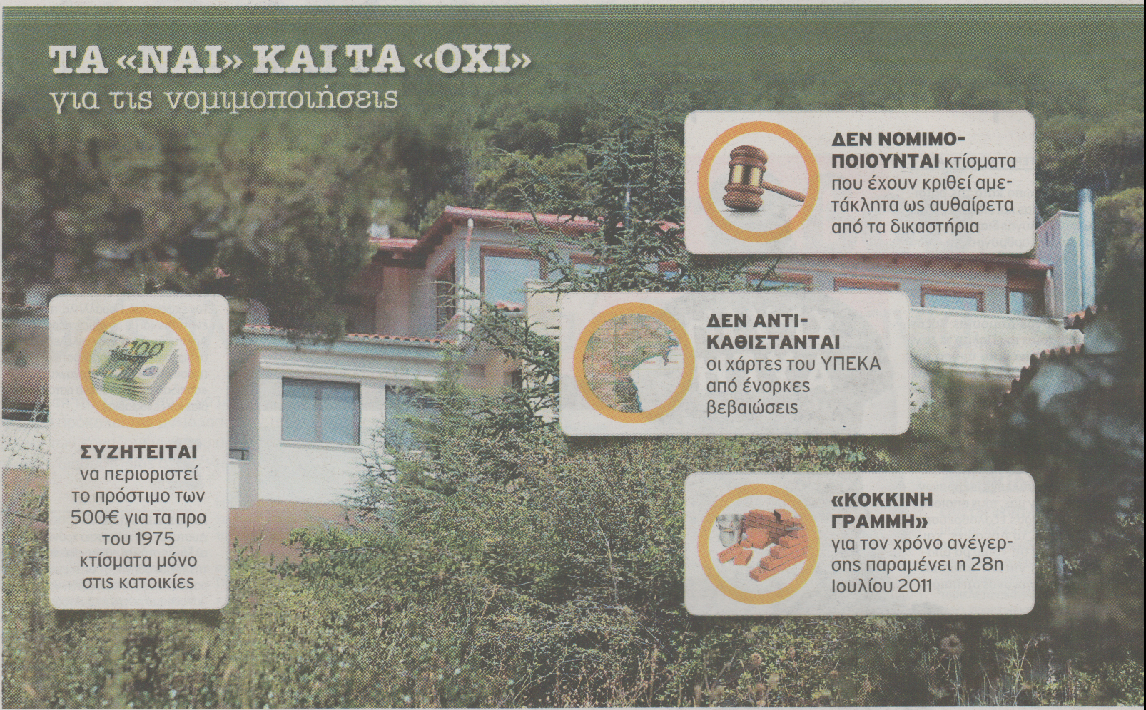 Το ΥΠΕΚΑ ανακοίνωσε πως όλα τα σχόλια των πολιτών θα ληφθούν υπόψη, ωστόσο ενημερωμένες πηγές τόνιζαν χθες πως αποκλείεται να παραβιαστεί η πρόβλεψη πως ο χρόνος ανέγερσης του αυθαιρέτου (ή η αυθαίρετη αλλαγή χρήσης) πρέπει να έχει συντελεστεί πριν από την 28 Ιουλίου 2011 και να αποδεικνύεται με δημόσιο έγγραφο. Ως δημόσιο έγγραφο θεωρούνται και οι αεροφωτογραφίες που θα εκδώσει το ΥΠΕΚΑ, οι οποίες θα είναι στη διάθεση κάθε ενδιαφερομένου.