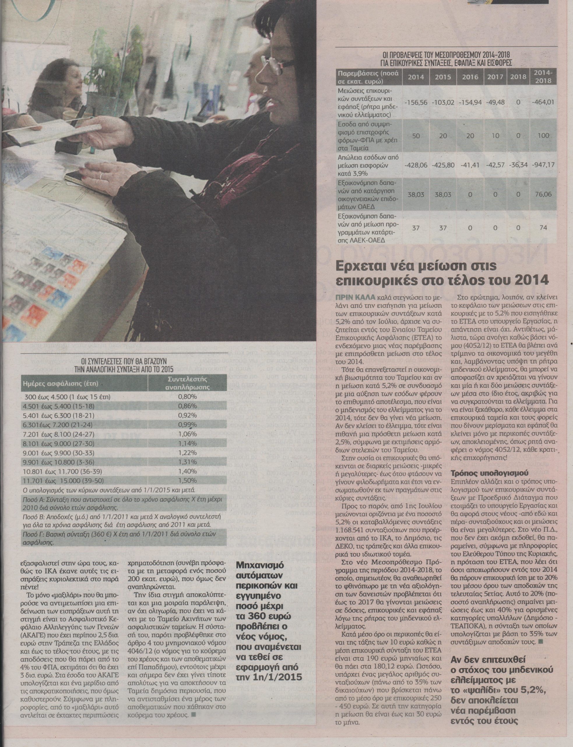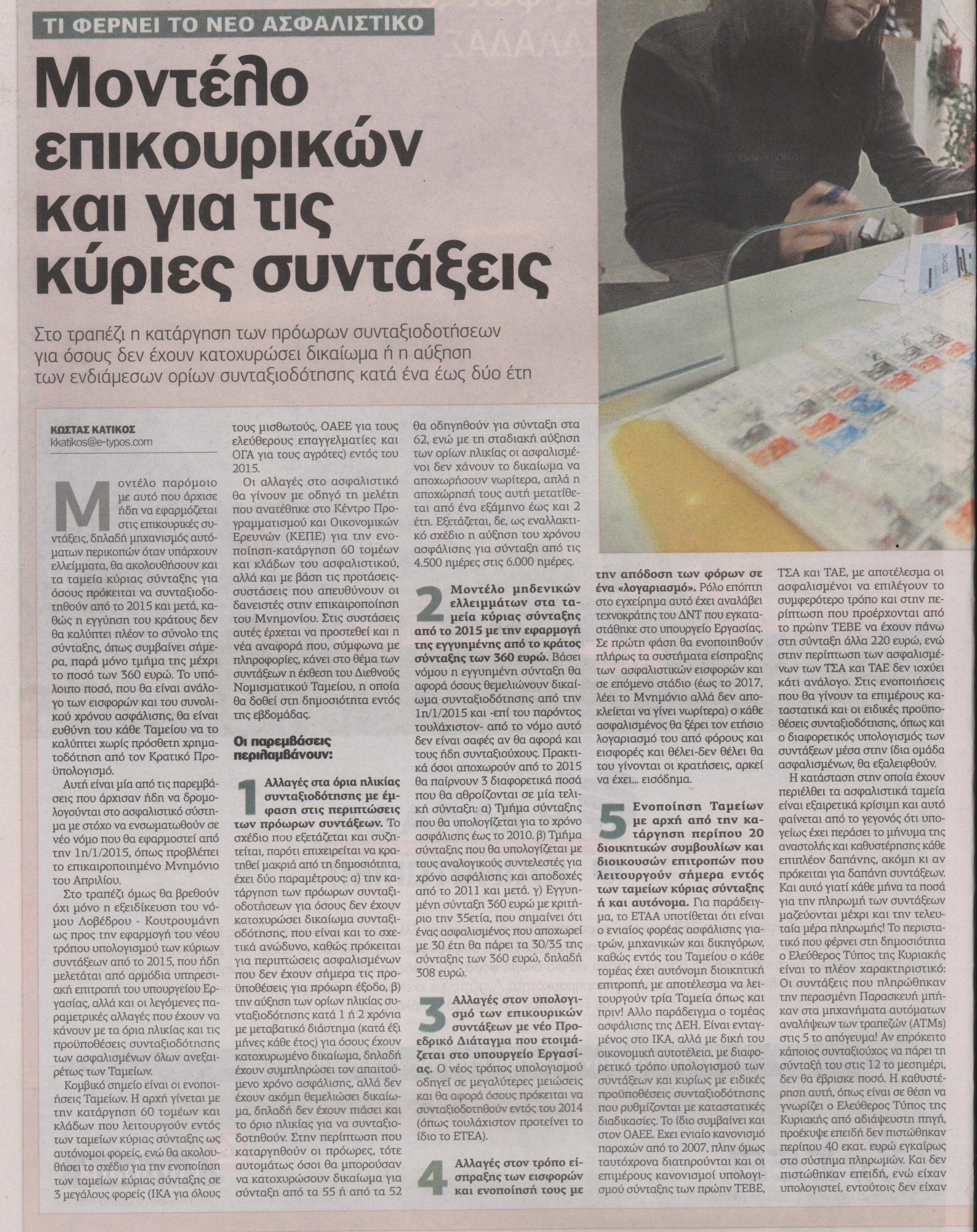 Όπως αναφέρει η εφημερίδα “Ελέυθερος Τύπος”, αυτή είναι μία από τις παρεμβάσεις που άρχισαν ήδη να δρομολογούνται στο ασφαλιστικό σύστημα με στόχο να ενσωματωθούν σε νέο νόμο που θα εφαρμοστεί από την 1η/1/2015, όπως προβλέπει το επικεροποιημένο μνημόνιο του Απριλίου.