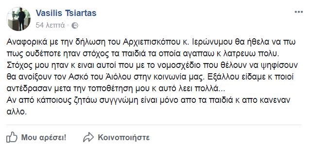 Τη δήλωση του Αρχιεπισκόπου Ιερώνυμου ότι του άρεσαν όσα είχε πει ο Βασίλης Τσιάρτας σχετικά με την αλλαγή ταυτότητας φύλου, σχολίασε μέσα από τον προσωπικό του λογαριασμό στο Facebook, ο ίδιος ο πρώην διεθνής ποδοσφαιριστής.Συγκεκριμένα, ο Αρχιεπίσκοπος Ιερώνυμος, μεταξύ άλλων ανέφερε: “Μου άρεσε αυτό που είπε αυτό το παλικάρι, ο αθλητής (σ.σ. Τσιάρτας). Εγώ όμως δεν το λέω ευχή, δεν θα θέλαμε τα παιδιά μας να υποστούν αυτό το μαρτύριο, γιατί και αυτά έχουν δικαιώματα στη ζωή. Ποιος ξέρει τι θα μας πουν όταν θα μεγαλώσουν”.Από την πλευρά του, ο Βασίλης Τσιάρτας ανέφερε πως οι δηλώσεις του, δεν είχαν ποτέ στόχο τα παιδιά, από τα οποία και ζητά συγγνώμη.Αναλυτικά η ανάρτησή του:“Αναφορικά με την δήλωση του Αρχιεπισκόπου κ. Ιερώνυμου θα ήθελα να πω πως ουδέποτε ήταν στόχος τα παιδιά τα οποία αγαπάω και λατρεύω πολύ. Στόχος μου ήταν και είναι αυτοί που με το νομοσχέδιο που θέλουν να ψηφίσουν θα ανοίξουν τον Ασκό του Αιόλου στην κοινωνία μας. Εξάλλου είδαμε και ποιοι αντέδρασαν μετά την τοποθέτηση μου και αυτό λέει πολλά…Αν από κάποιους ζητάω συγγνώμη είναι μόνο από τα παιδιά και από κανέναν άλλο.”