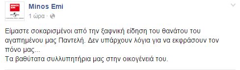 “Είμαστε σοκαρισμένοι από την ξαφνική είδηση του θανάτου του αγαπημένου μας Παντελή. Δεν υπάρχουν λόγια για να εκφράσουν τον πόνο μας…