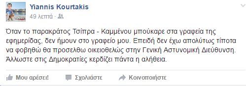 Με αφορμή τη σύλληψη του Διευθυντή του Ομίλου “Παραπολιτικά”, Παναγιώτη Τζένου, ο εκδότης της εφημερίδας “Παραπολιτικά” Γιάννης Κουρτάκης έγραψε στο Facebook:
