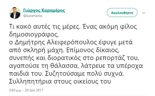 Τη θλίψη του για τον θάνατο του δημοσιογράφου Δημήτρη Αλειφερόπουλου, ο οποίος άφησε σήμερα την τελευταία του πνοή σε ηλικία 47 ετών, εξέφρασε μέσω ανάρτησής του στο Twitter, o αντιπεριφερειάρχης Αττικής, Γιώργος Καραμέρος.