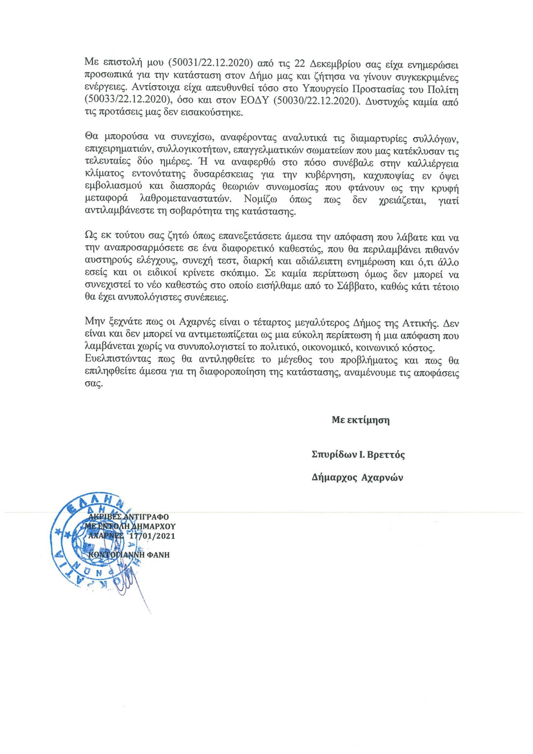 Την άρση του αυστηρού lockdown ζητεί ο Δήμαρχος Αχαρνών με επιστολή του στον Νίκο Χαρδαλιά. Ο Σπύρος Βρεττός, μετά τη λήψη επιπλέον περιοριστικών μέτρων στον Δήμο Αχαρνών απευθύνθηκε στον υφυπουργό Πολιτικής Προστασίας, εξηγώντας του τους λόγους για τους οποίους πρέπει να επανεξεταστεί άμεσα η απόφαση. Παράλληλα υπενθύμισε τα αιτήματα που είχε κάνει ο Δήμος τον περασμένο μήνα προκειμένου να αποφευχθεί περαιτέρω διασπορά.