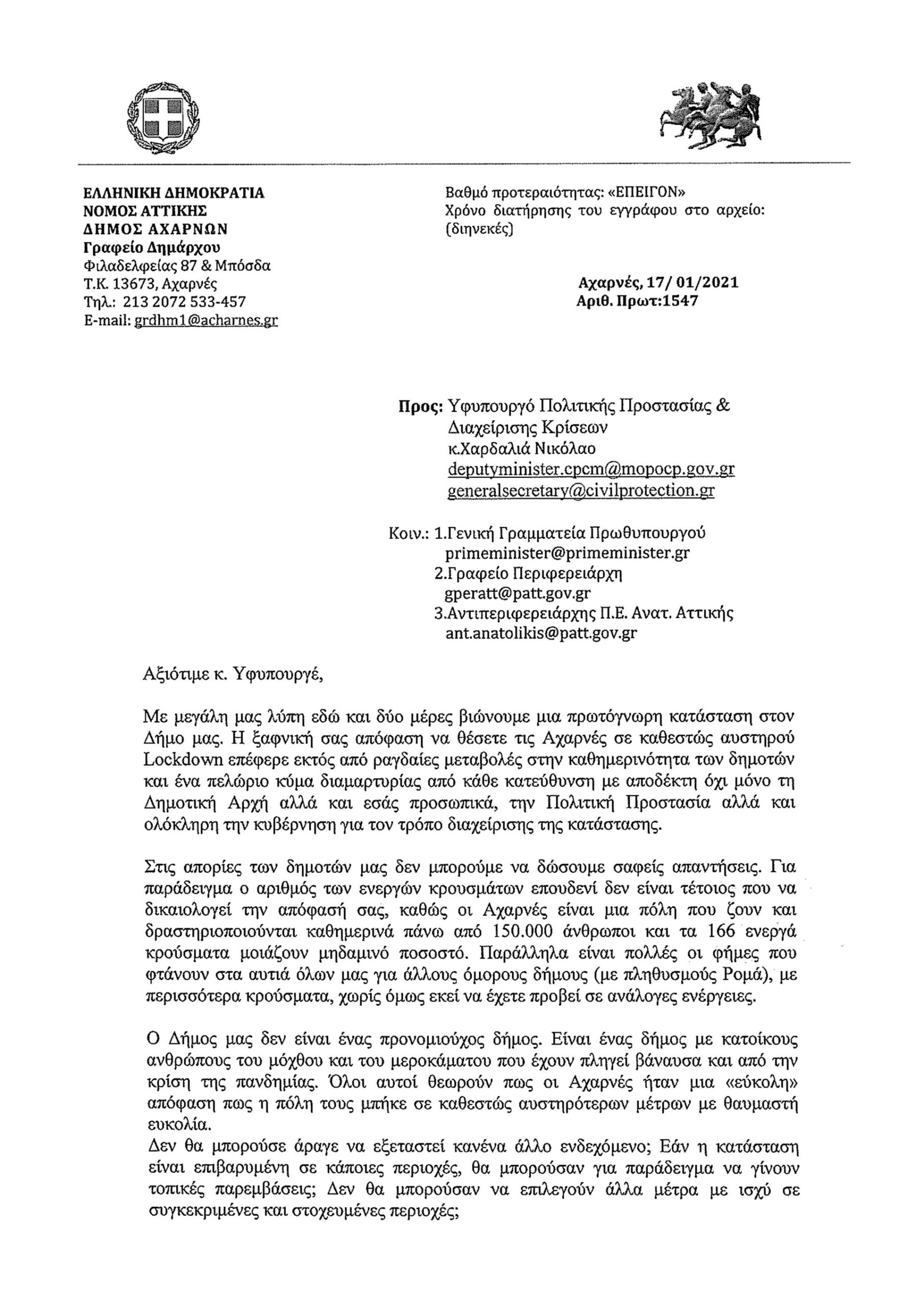 “Η ξαφνική σας απόφαση να θέσετε τις Αχαρνές σε καθεστώς αυστηρού lockdown επέφερε εκτός από ραγδαίες μεταβολές στην καθημερινότητα των δημοτών, και ένα πελώριο κύμα διαμαρτυρίας από κάθε κατεύθυνση με αποδέκτη όχι μόνο τη δημοτική αρχή αλλά και εσάς προσωπικά, την Πολιτική Προστασία και ολόκληρη την κυβέρνηση για τον τρόπο διαχείρισης της κατάστασης. Στις απορίες των δημοτών μας δεν μπορούμε να δώσουμε σαφείς απαντήσεις. Για παράδειγμα ο αριθμός των ενεργών κρουσμάτων επουδενί δεν είναι τέτοιος που να δικαιολογεί την απόφασή σας, καθώς οι Αχαρνές είναι μια πόλη που ζουν και δραστηριοποιούνται καθημερινά πάνω από 150.000 άνθρωποι και τα 166 ενεργά κρούσματα μοιάζουν μηδαμινό ποσοστό. Παράλληλα, είναι πολλές οι φήμες που φτάνουν στα αυτιά όλων μας για άλλους όμορους δήμους (με πληθυσμούς Ρομά) , με περισσότερα κρούσματα, χωρίς όμως εκεί να έχετε προβεί σε ανάλογες ενέργειες” αναφέρει στην επιστολή του.