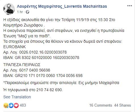 Το μεσημέρι της Τετάρτης, στο Κοιμητήριο Ζωγράφου, πρόκειται να πραγματοποιηθεί η κηδεία του Λαυρέντη Μαχαιρίτσα, όπως ανακοίνωσε η οικογένειά του με νέα ανάρτηση στο Facebook. Καλεί επίσης, αντί στεφάνων, να ενισχυθεί η πρωτοβουλία Ένωση “Μαζί για το παιδί”.