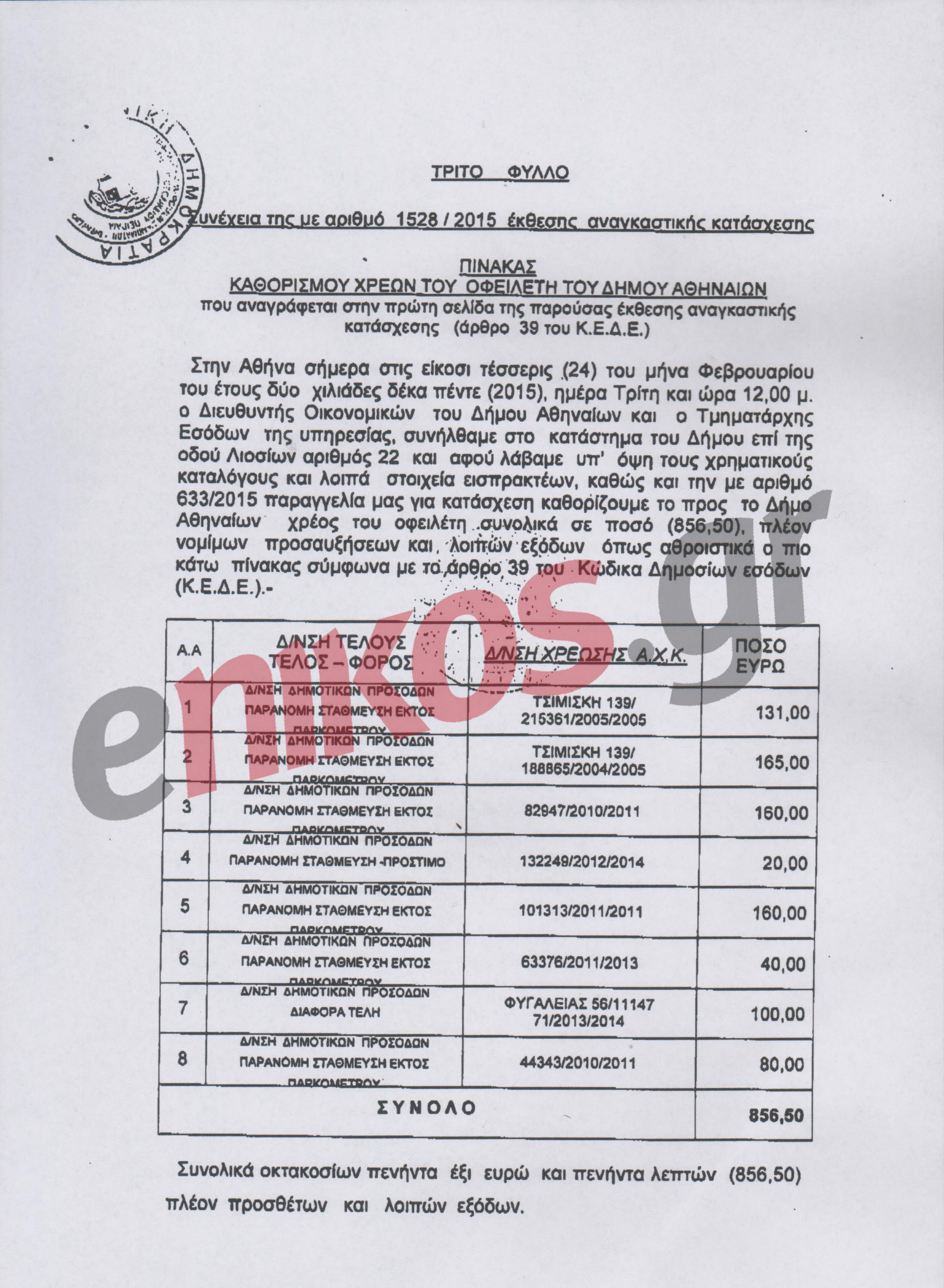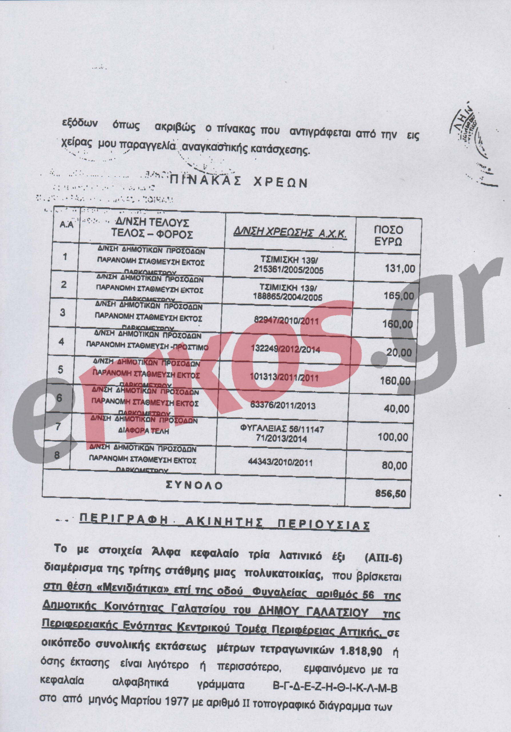 Να χάσει το σπίτι της κινδυνεύει η κ. Παναγιώτα Ταπάσκου καθώς ο Δήμος Αθηναίων την απειλεί με κατάσχεση εξαιτίας οφειλών της, ύψους 856 ευρώ (!), από κλήσεις για παράνομη στάθμευση. Χθες το πρωί ο δικαστικός επιμελητής παρέδωσε στην κ. Ταπάσκου την έκθεση αναγκαστικής κατάσχεσης ακίνητης περιουσίας για ακίνητο ιδιοκτησίας της στην περιοχή του Γαλατσίου παραθέτοντας αναλυτική κατάσταση των οφειλών της προς το Δήμο Αθηναίων.