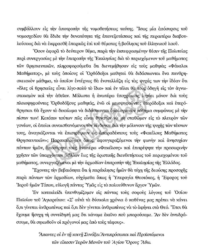“Αναφορικώς με το προς ψήφιση νομοσχέδιο διερωτώμεθα πλέον τι μας επιφυλάσσεται στο μέλλον!” – αναφέρει χαρακτηριστηκά η επιστολή του Αγίου Όρους.