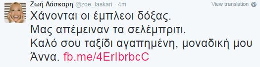 «Χάνονται οι έμπλεοι δόξας. Μας απέμειναν τα σελέμπριτι. Καλό σου ταξίδι αγαπημένη, μοναδική μου Άννα»