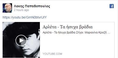 Ο τραγουδιστής και μουσικοσυνθέτης Λάκης Παπαδόπουλος θέλησε να αποχαιρετήσει με έναν λιτό τρόπο την αγαπημένη του φίλη Αρλέτα, η οποία έφυγε από τη ζωή σήμερα σε ηλικία 72 ετών.Χωρίς κανένα σχόλιο, ο Λάκης Παπαδόπουλος ανέβασε στον προσωπικό του λογαριασμό στο facebook, το τραγούδι «Τα ήσυχα βράδια», σε στίχους Μαριανίνας Κριεζή και μουσική του ίδιου, το οποίο έχει ερμηνεύσει μοναδικά η Αρλέτα.