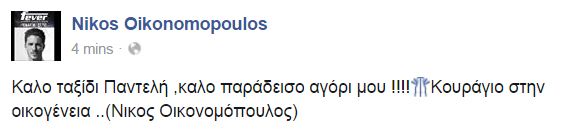«Κάλο ταξίδι Παντελή, καλό παράδεισο αγόρι μου !!!! Κουράγιο στην οικογένεια.. (Νίκος Οικονομόπουλος)» έγραψε ο τραγουδιστής.