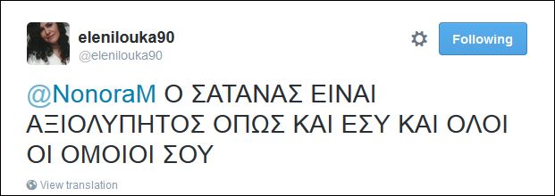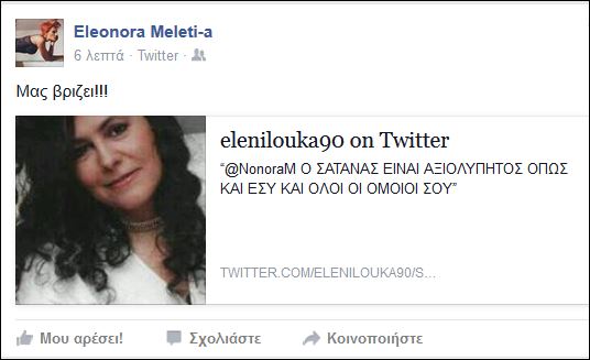 Η Ελένη Λουκά επιτέθηκε μέσω Twitter στην Ελεονώρα Μελέτη. «Ο σατανάς είναι αξιολύπητος όπως και εσύ και όλοι οι όμοιοι σου», έγραψε στη γνωστή παρουσιάστρια, η οποία ανέβασε το tweet στο λογαριασμό της στο Facebook με το εξής σχόλιο: «Μας βρίζουν».