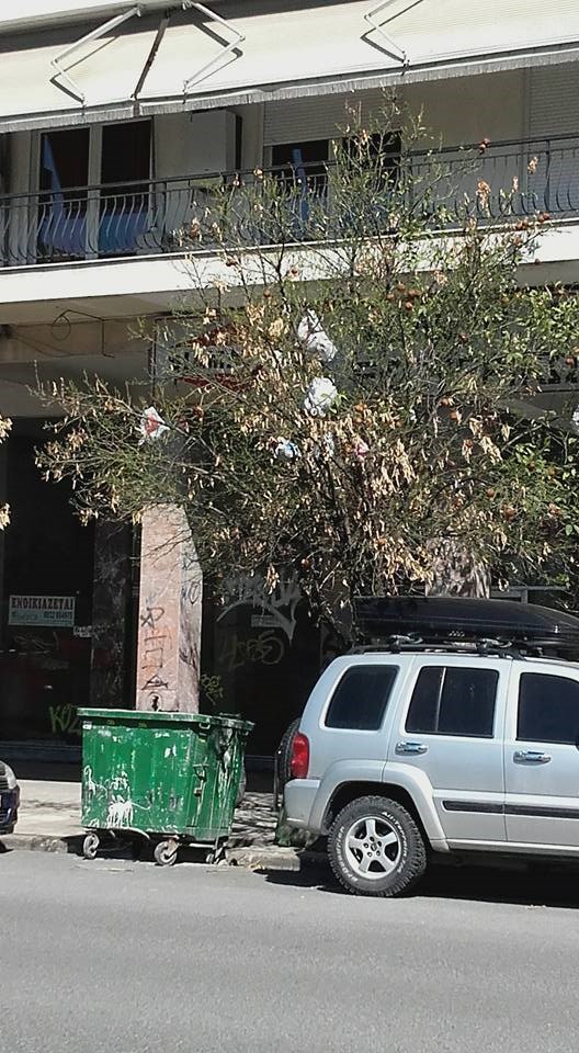 Σακούλες με σκουπίδια κρέμονται ανάμεσα στα κλαδιά μια νερατζιάς σε δρόμο της Θεσσαλονίκης. Η φωτογραφία κάνει τον γύρο του διαδικτύου και όπως φαίνεται, το δέντρο βρίσκεται κάτω από μια πολυκατοικία, ακριβώς δίπλα στον κάδο σκουπιδιών. Οι κάτοικοι, προφανώς αντί να κάνουν τον κόπο να κατέβουν για να πετάξουν τα σκουπίδια, τα πετούν από τα μπαλκόνια τους και μάλλον δεν βρίσκουν τον …στόχο δημιουργώντας αυτή τη θλιβερή εικόνα.