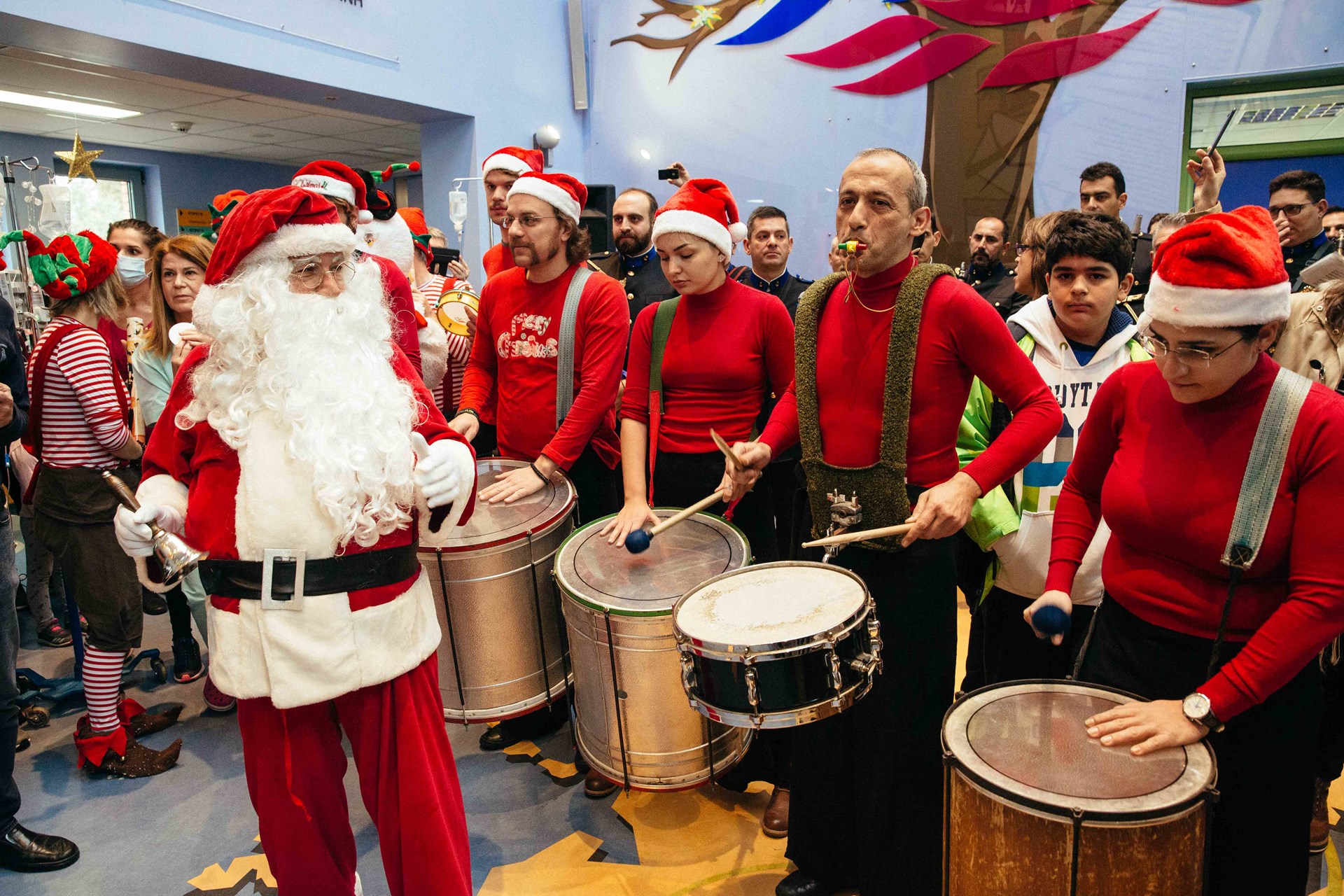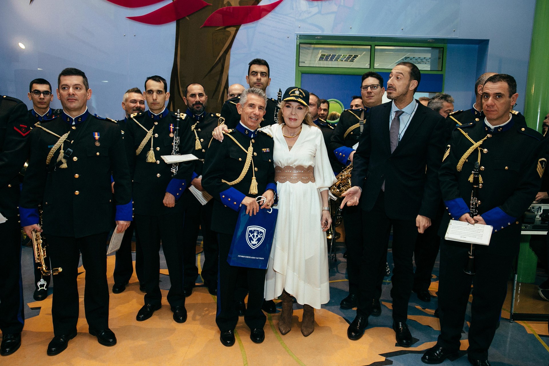 Παράλληλα, η μπάντα του Πολεμικού Ναυτικού με χριστουγεννιάτικες μελωδίες που αντηχούσαν από άκρη σε άκρη στην Ογκολογική Μονάδα δημιούργησε μια μοναδική ατμόσφαιρα χαράς και αισιοδοξίας! Τα μέλη της μπάντας του Πολεμικού Ναυτικού, που διαχρονικά στέκονται στο πλευρό της «ΕΛΠΙΔΑΣ», ευχήθηκαν σε όλους «Χρόνια Πολλά» και προσέφεραν στην κυρία Βαρδινογιάννη, ένα αναμνηστικό καπέλο του Πολεμικού Ναυτικού.