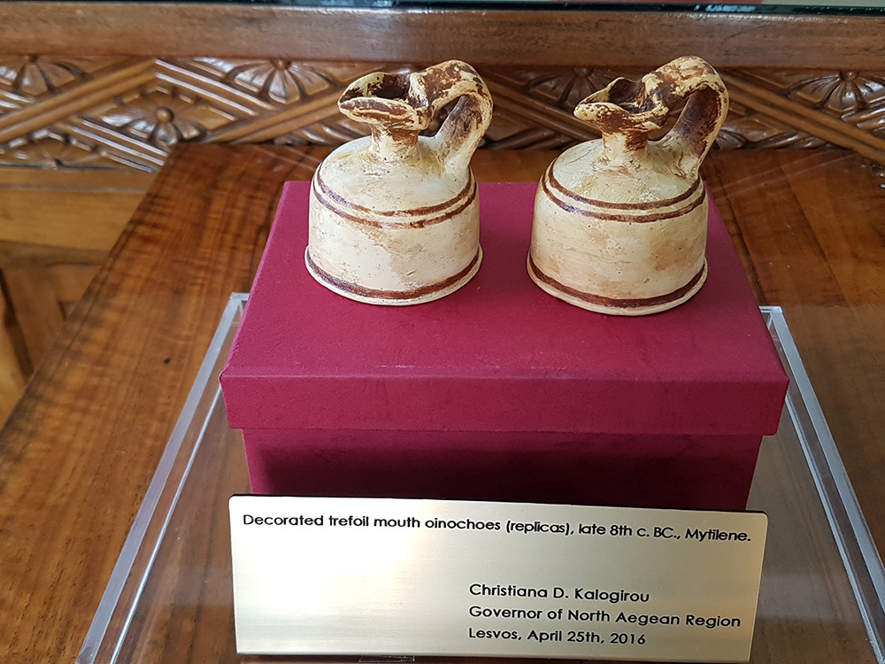 Η Περιφερειάρχης Βορείου Αιγαίου, Χριστιάνα Καλογήρου προσέφερε στην βασίλισσα της Ιορδανίας δύο μοναδικά αντίγραφα μυροδοχείων του 8ου π.Χ. αιώνα, τα οποία βρέθηκαν σε ανασκαφή στην περιοχή της Επάνω Σκάλας, δηλαδή πολύ κοντά στον καταυλισμό του Καρά Τεπέ.