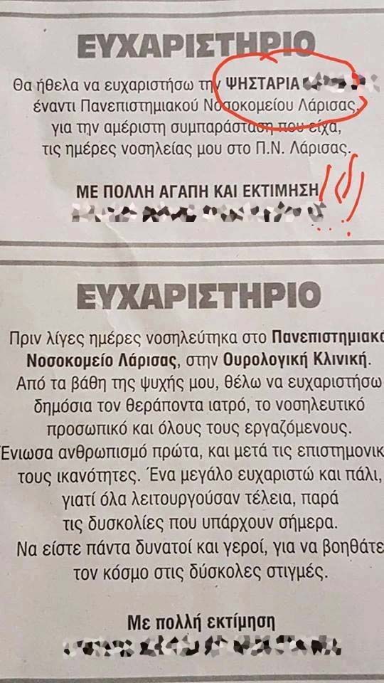 Στην αγγελία του ο άνδρας αρχικά ευχαριστεί τη ψησταριά που λειτουργεί κοντά στο Πανεπιστημιακό νοσοκομείο της Λάρισας “για την αμέριστη συμπαράσταση που είχε τις ημέρες της νοσηλεία του” και στη συνέχεια τον γιατρό του, το νοσηλευτικό προσωπικό και τους υπαλλήλους του νοσοκομείου.