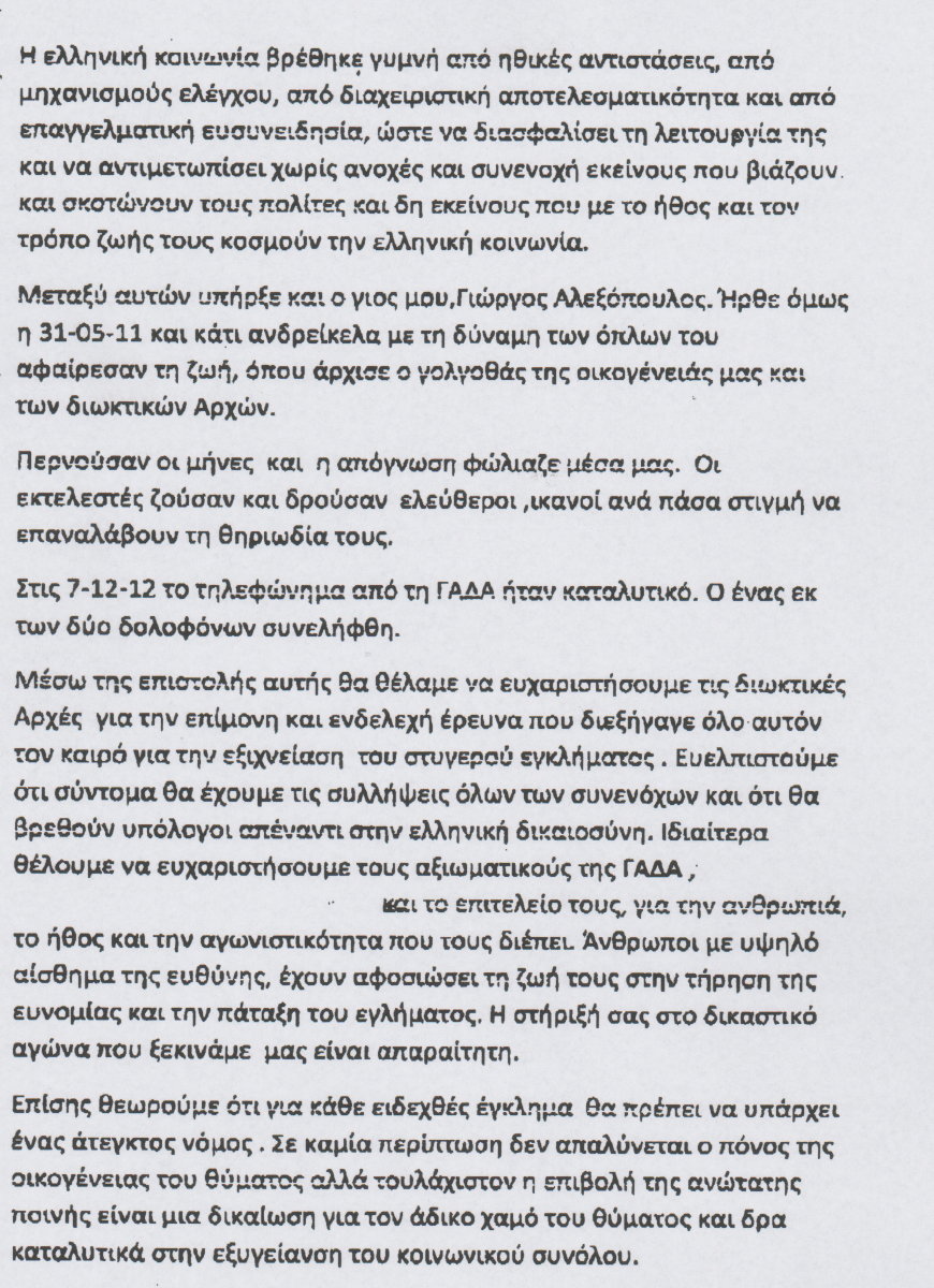 Η οικογένεια του αδικοχαμένου νέου ευχαριστεί με επιστολή της τις διωκτικές αρχές, που συνέλαβαν τους δράστες.