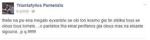 “Θέλω να πω ένα μεγάλο ευχαριστώ σε όλο τον κόσμο για την στήριξή τους σε όλους τους τομείς…Ο Παντέλος θα είναι περήφανος για όλους μας να είστε σίγουροι…” έγραψε και ανέβασε μια φωτογραφία με τον αδελφό του.