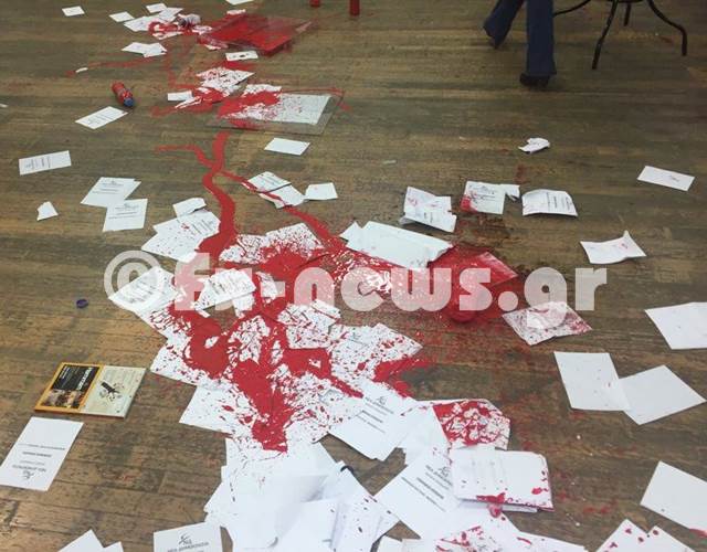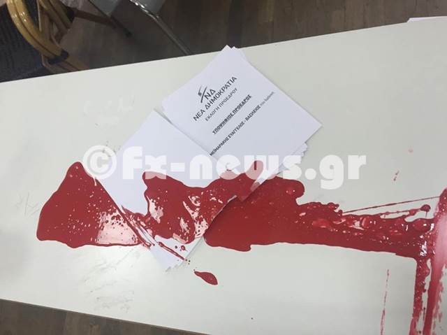 Κόκκινη μπογιά σε ψηφοδέλτια και συνθήματα στους τοίχους βλέπουν οι ψηφοφόροι της ΝΔ που επισκέπτονται το εκλογικό κέντρα στη Νέα Φιλαδέλφεια, στο οποίο εισέβαλαν μέλη της ομάδα «Ρουβίκωνας».