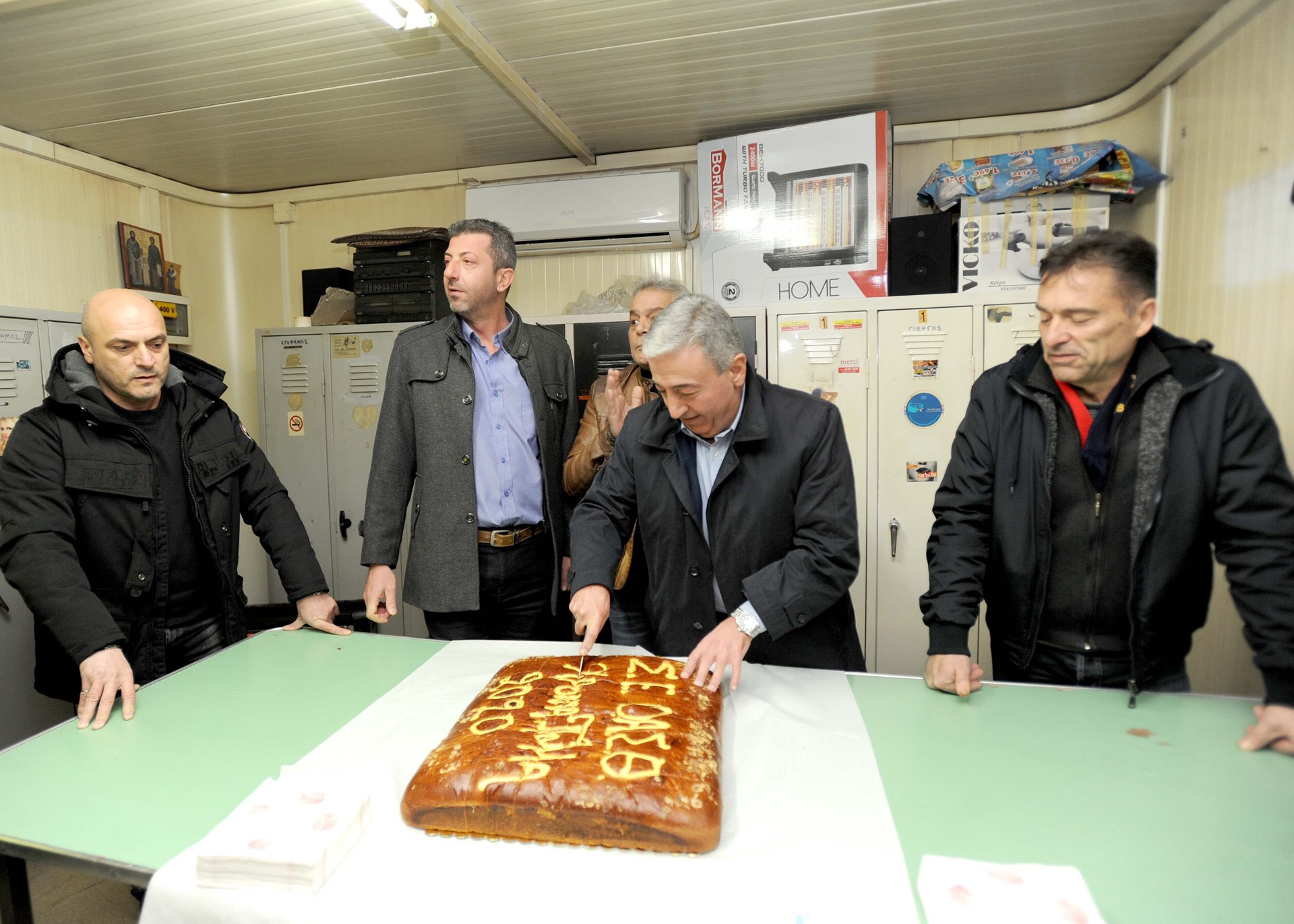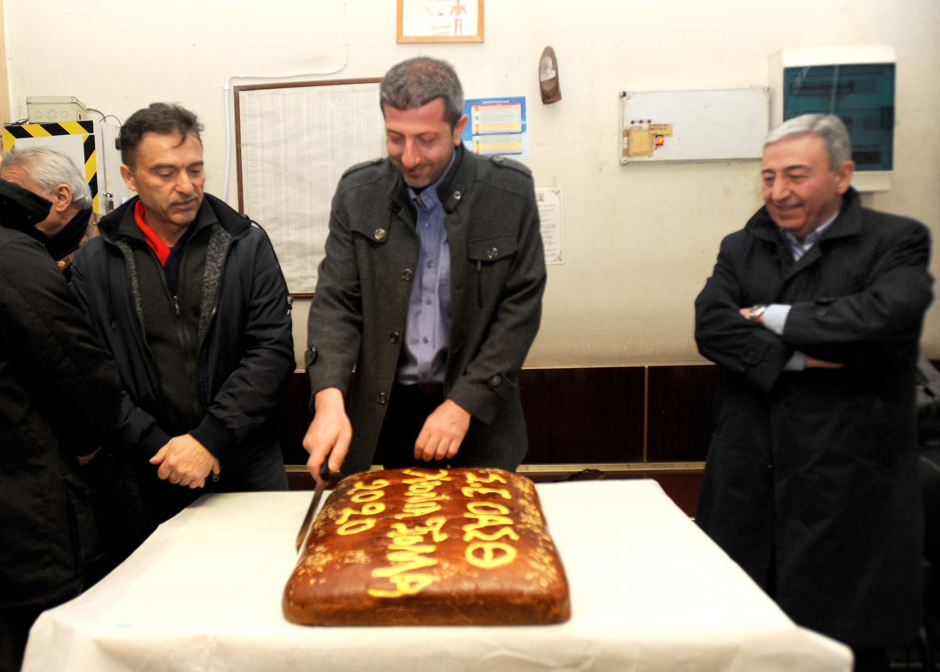 Ο πρόεδρος του ΕΚΘ Χάρης Κυπριανίδης και ο μέχρι πρότινος πρόεδρος του ΕΚΘ Παναγιώτης Τσαραμπουλίδης, έκοψαν την πίτα με τους εργαζομένους της βάρδιας στα αμαξοστάσια του ΟΑΣΘ στο Φοίνικα και τη Σταυρούπολη, όπως και με τους εργαζομένους στο εργοστάσιο ΤΙΤΑΝ.