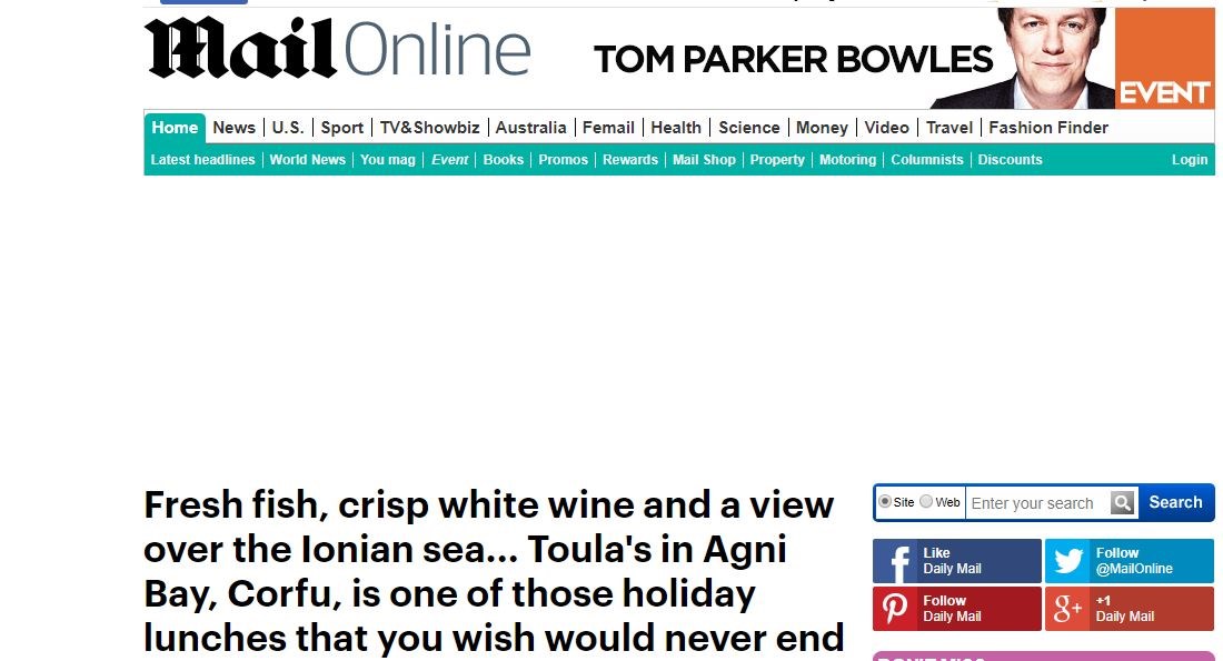 Ο τίτλος του δημοσιεύματος είναι “Φρέσκο ψάρι, καλό κρασί και θέα στο Ιόνιο Πέλαγος…το εστιατόριο Toula’s στην παραλία Αγνί της Κέρκυρας, είναι το μέρος που το γεύμα των διακοπών σου θα ήθελες να μην τελειώσει ποτέ”.