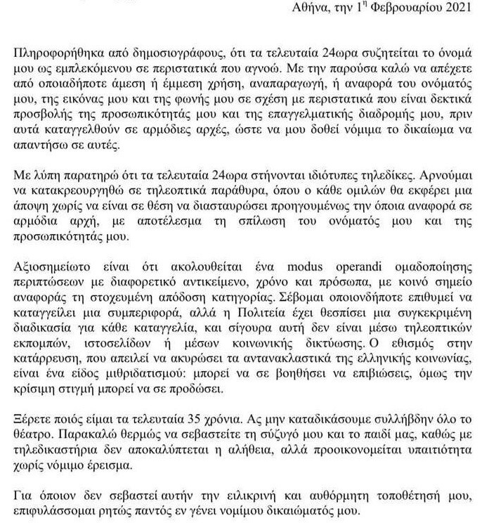 «Ξέρετε ποιος είμαι τα τελευταία 35 χρόνια. Ας μην καταδικάσουμε συλλήβδην όλο το θέατρο». Επικαλείται δε τη σύζυγο και το παιδί του, λέγοντας ότι «με τα τηλεδικαστήρια δεν αποκαλύπτεται η αλήθεια αλλά προοικονομείται υπαιτιότητα χωρίς νόμιμο έρεισμα» και προειδοποιεί όποιον δεν σεβαστεί την τοποθέτησή του πως επιφυλάσσεται ρητώς παντός εν γένει νόμιμου δικαιώματός του.