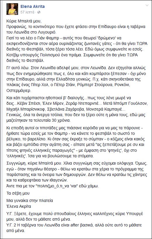 Την έντονη αντίδρασή της εξέφρασε και η Έλενα Ακρίτα με ανοιχτή επιστολή προς τον υπουργού Πολιτισμού και Αθλητισμού Αριστείδη Μπαλτά, που δημοσίευσε στην προσωπική της σελίδα στο Facebook.