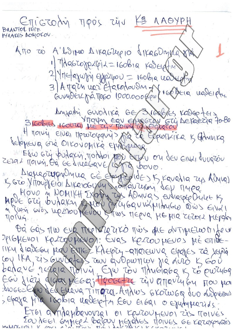 Η επιστολή που βλέπετε εστάλη από τον ίδιο στο Lamiastar.gr μέσα από τις φυλακές.