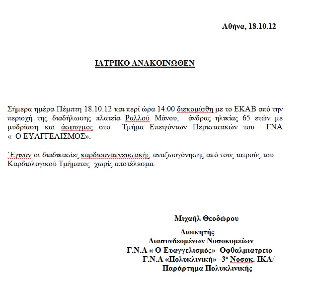 Πριν από λίγα λεπτά ο Ευαγγελισμός εξέδωσε ιατρικό ανακοινωθέν για τον άτυχο 65χρονο διαδηλωτή που έχασε την ζωή του.