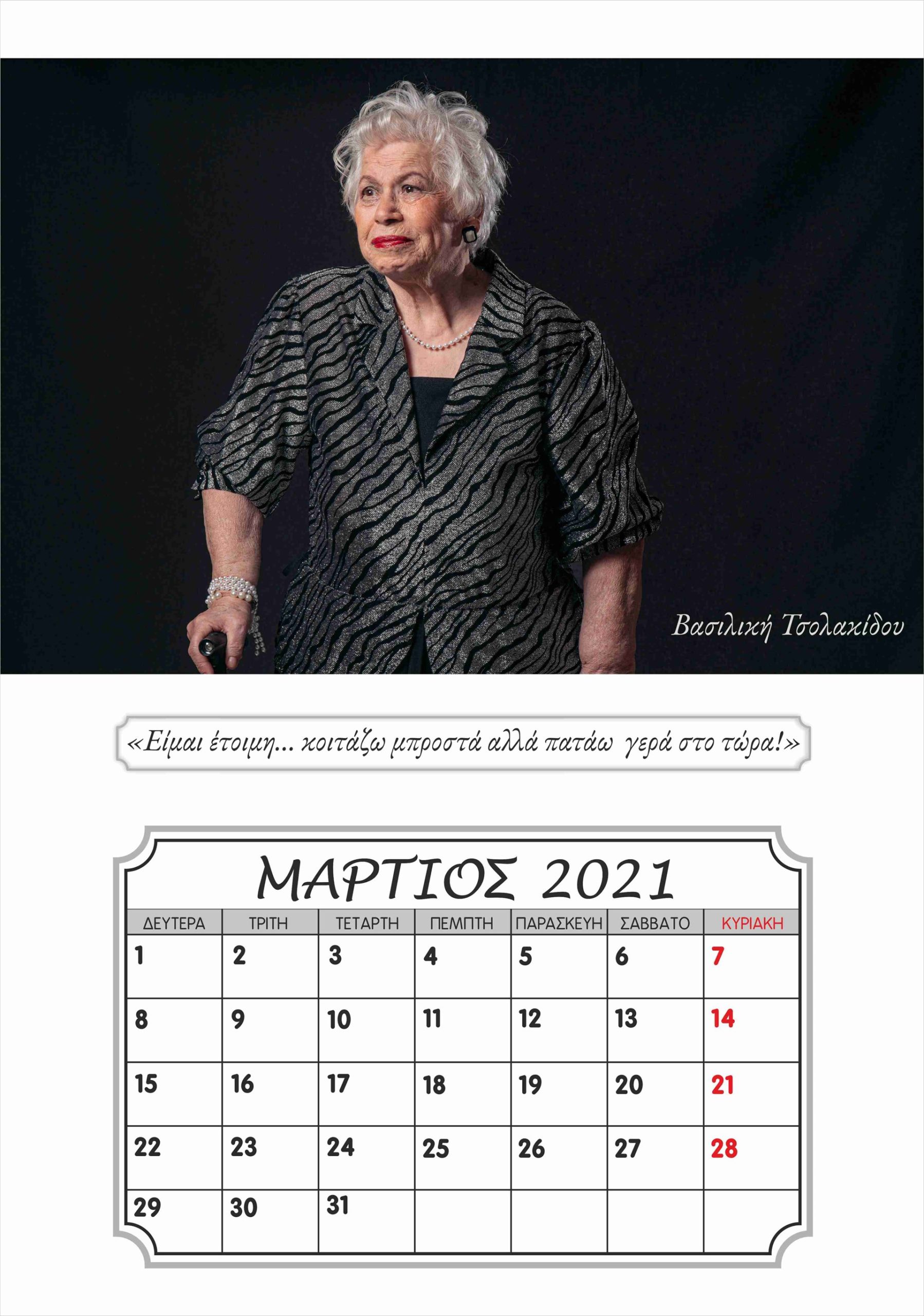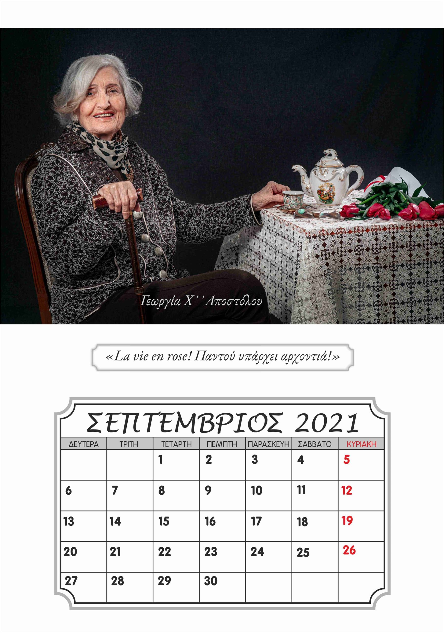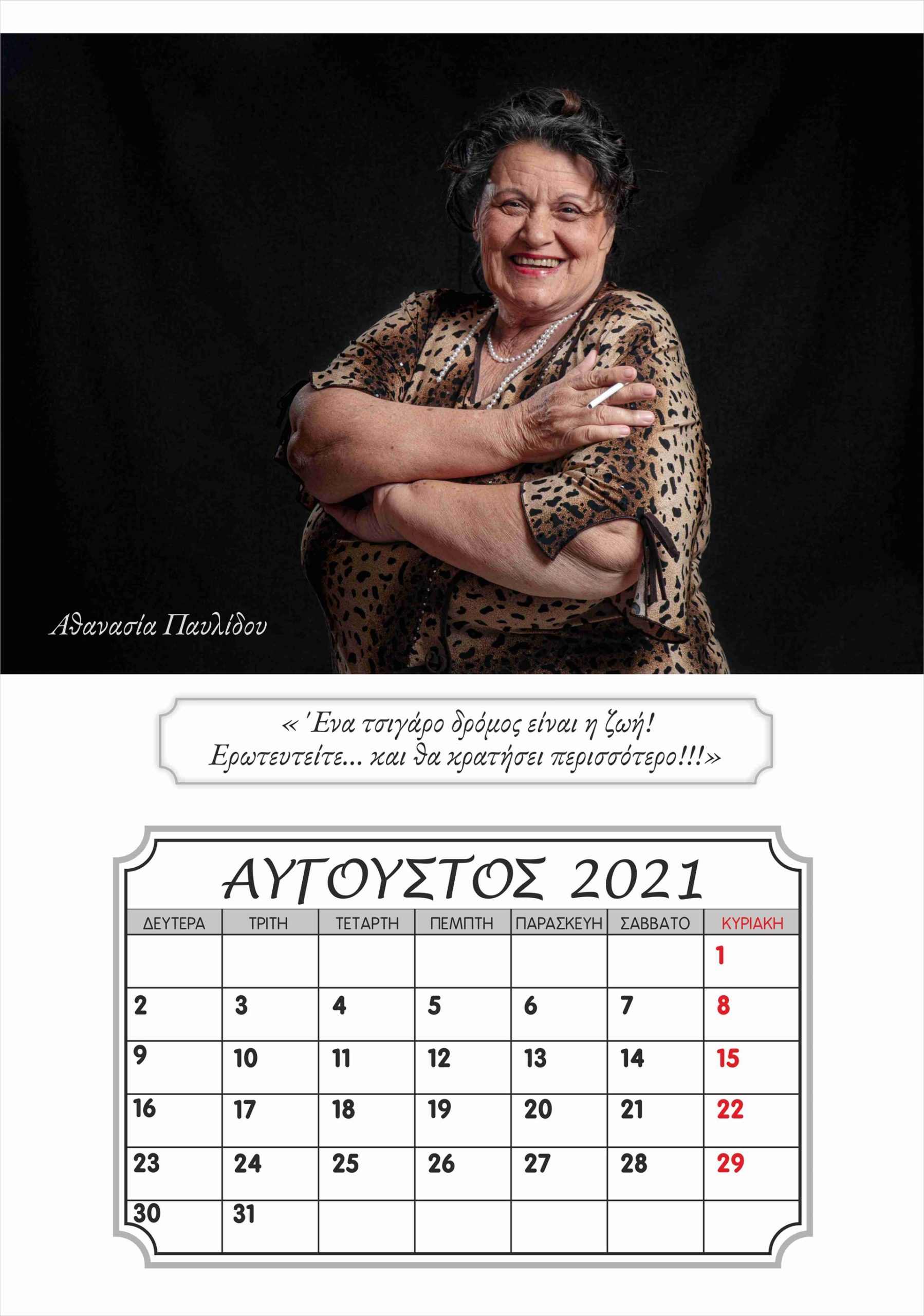 Η Καλλιόπη Νάκου, η οποία ποζάρει με χάρη …μοντέλου μπροστά στον φωτογραφικό φακό, είναι μία από τους ενοίκους της ξεχωριστής αυτής μονάδας φροντίδας ηλικιωμένων στην Ξάνθη, του «γηροκομείου της καρδιάς μας», όπως γράφει και η ταμπέλα με την οποία τους επισκέπτες στους χώρους του. Μαζί με τους συνενοίκους της στο γηροκομείο, τον Λευτέρη Γιαγκίδη, που ποζάρει με το χαρακτηριστικό «καβουράκι» του και το κομπολόι στο χέρι στο εξώφυλλο του ημερολογίου, αλλά και τους Βασιλική Τσοκαλίδου, Κουιμέτ Μουσταφά Ογλού, Αθανασία και Θεόδωρο Παυλίδη, Χαράλαμπο Καραβασίλογλου, Αγαθή Ανδρεάδου, Γεωργία Χατζηαποστόλου και Ευαγγελία Καρακεσίσογλου, η Καλλιόπη Νάκου πόζαρε στον φακό της καλλιτεχνικής ομάδας φωτογραφίας του «ΕΡΓΑΣΤΗΡΙΟΥ ΦΩΤΟΓΡΑΦΙΑΣ», έτους 2019-2020, του Ιδρύματος Θρακικής Τέχνης και Παράδοσης (Ι.Θ.Π.Τ) Ξάνθης. Η καλλιτεχνική αυτή ομάδα μαζί με το γηροκομείο «Ο Μέγας Βασίλειος» και την εθελόντρια Σοφία Σαλβανά ένωσαν δυνάμεις και φαντασία και μεταμόρφωσαν τους ηλικιωμένους σε «πρωταγωνιστές σε πρώτο πλάνο».