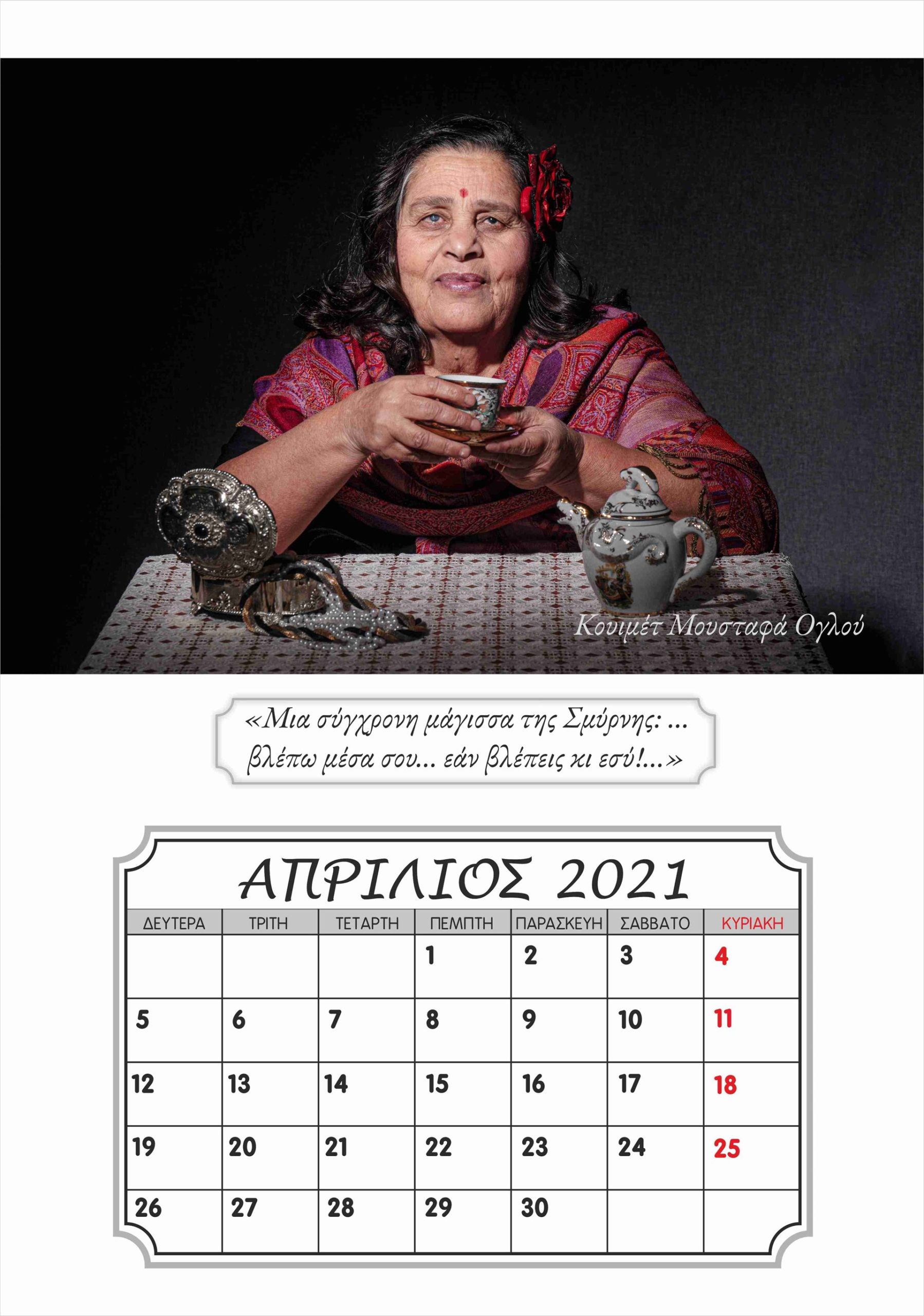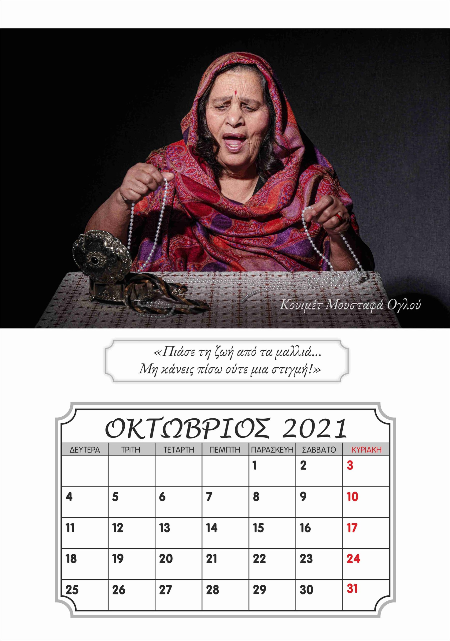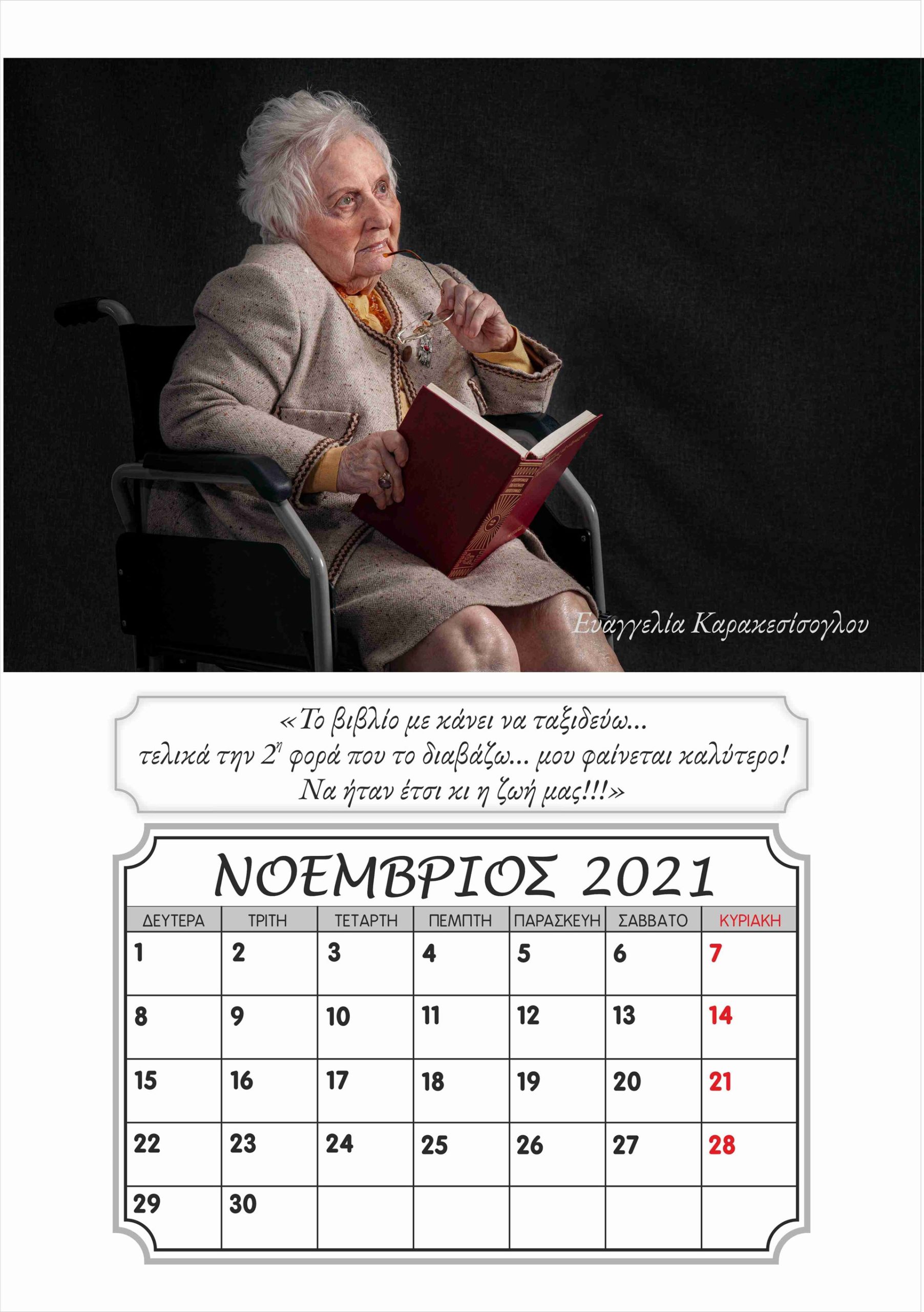 Η Καλλιόπη Νάκου, η οποία ποζάρει με χάρη …μοντέλου μπροστά στον φωτογραφικό φακό, είναι μία από τους ενοίκους της ξεχωριστής αυτής μονάδας φροντίδας ηλικιωμένων στην Ξάνθη, του «γηροκομείου της καρδιάς μας», όπως γράφει και η ταμπέλα με την οποία τους επισκέπτες στους χώρους του. Μαζί με τους συνενοίκους της στο γηροκομείο, τον Λευτέρη Γιαγκίδη, που ποζάρει με το χαρακτηριστικό «καβουράκι» του και το κομπολόι στο χέρι στο εξώφυλλο του ημερολογίου, αλλά και τους Βασιλική Τσοκαλίδου, Κουιμέτ Μουσταφά Ογλού, Αθανασία και Θεόδωρο Παυλίδη, Χαράλαμπο Καραβασίλογλου, Αγαθή Ανδρεάδου, Γεωργία Χατζηαποστόλου και Ευαγγελία Καρακεσίσογλου, η Καλλιόπη Νάκου πόζαρε στον φακό της καλλιτεχνικής ομάδας φωτογραφίας του «ΕΡΓΑΣΤΗΡΙΟΥ ΦΩΤΟΓΡΑΦΙΑΣ», έτους 2019-2020, του Ιδρύματος Θρακικής Τέχνης και Παράδοσης (Ι.Θ.Π.Τ) Ξάνθης. Η καλλιτεχνική αυτή ομάδα μαζί με το γηροκομείο «Ο Μέγας Βασίλειος» και την εθελόντρια Σοφία Σαλβανά ένωσαν δυνάμεις και φαντασία και μεταμόρφωσαν τους ηλικιωμένους σε «πρωταγωνιστές σε πρώτο πλάνο».