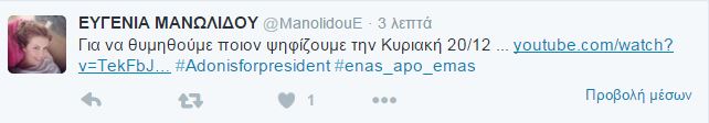 Η Ευγενία Μανωλίδου έκανε μια ανάρτηση στον προσωπικό της λογαριασμό στο Twitter ,με την οποία προτρέπει ουσιαστικά τους χρήστες του μέσου κοινωνικής δικτύωσης να ψηφίσουν τον σύζυγό της, Α. Γεωργιάδη την Κυριακή 20/12, στις επικείμενες εκλογές για την ανάδειξη του προέδρου της Νέας Δημοκρατίας.