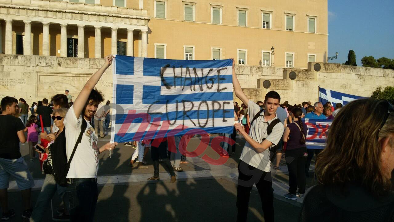 Με ελληνικές σημαίες και πανό φτάνουν στο Σύνταγμα οι διαδηλωτές, όπου είναι σε εξέλιξη η συγκέντρωση υπέρ του “όχι” στο δημοψήφισμα της Κυριακής.
