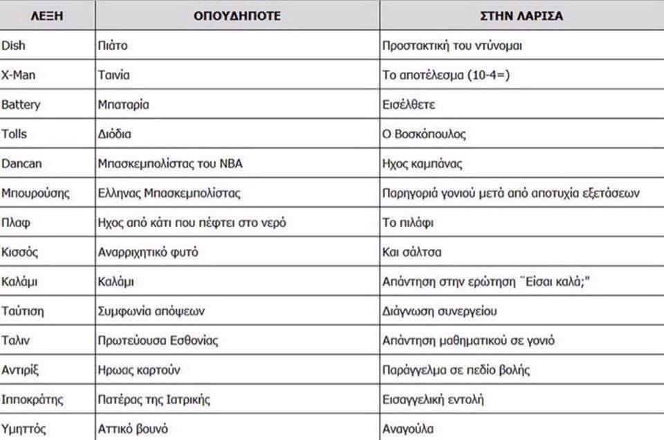 Viral έχει γίνει στο διαδίκτυο ένα… λεξικό με διάφορες λέξεις στα Ελληνικά αλλά και στα Αγγλικά, μεταφρασμένες στην… τοπική διάλεκτο της Λάρισας.