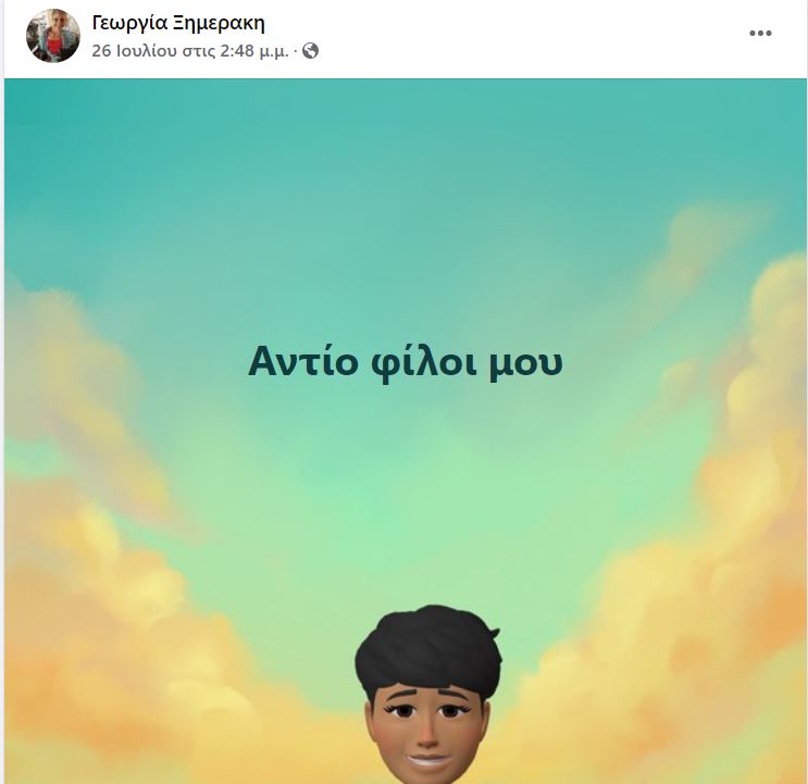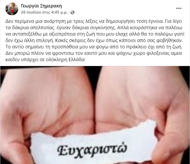 “Δεν περίμενα μια ανάρτηση με τρεις λέξεις να δημιουργήσει τόση έγνοια. Για λίγο τα δάκρυα απελπισίας έγιναν δάκρυα συγκίνησης. Απλά κουράστηκα να παλεύω να ανταπεξέλθω με αξιοπρέπεια στη ζωή που μου έλαχε αλλά θα το παλέψω γιατί δεν έχω άλλη επιλογή. Κακές σκέψεις δεν έχω όπως κάποιοι από σας φοβήθηκαν. Το αντίο σημαίνει τη προσπάθεια μου να φύγω από το Ηράκλειο όχι από τη ζωή. Δεν μπορώ πλέον να φροντίσω τον εαυτό μου και ψάχνω χώρο φιλοξενίας ΑΜΕΑ και δεν υπάρχει σε ολόκληρη Ελλάδα” έγραψε χαρακτηριστικά.