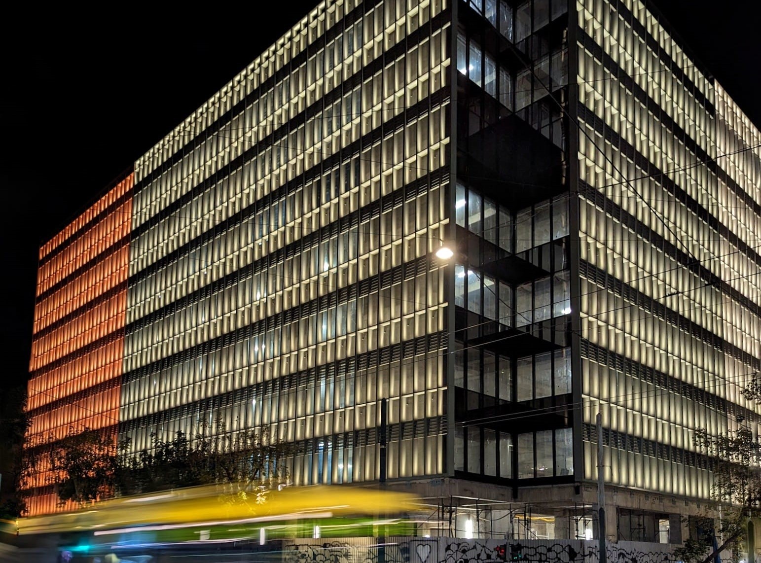 Τα φώτα που «έλουσαν» το «Μινιόν» ήταν το ιστορικό πορτοκαλί του πολυκαταστήματος των περασμένων δεκαετιών, το πράσινο της ελιάς και το λευκό επί της οδού Βερανζέρου.