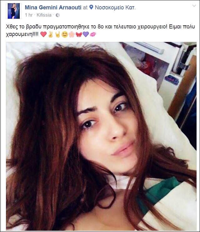 Το τελευταίο της χειρουργείο πραγματοποίησε η Μίνα Αρναούτη, η οποία νοσηλεύεται εδώ και λίγες μέρες στο ΚΑΤ.Η νεαρή κοπέλα ανέβασε στον προσωπικό της λογαριασμό, στο facebook τη συγκεκριμένη φωτογραφία, συνοδεύοντάς της με το εξής σχόλιο: «Χθες το βράδυ πραγματοποιήθηκε το 8ο και τελευταίο χειρουργείο! Είμαι πολύ χαρούμενη!!!».