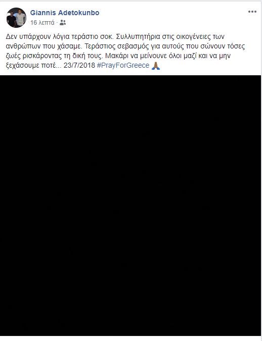 «Δεν υπάρχουν λόγια τεράστιο σοκ. Συλλυπητήρια στις οικογένειες των ανθρώπων που χάσαμε» έγραψε στο λογαριασμό του στο Facebook ο Γιάννης Αντετοκούνμπο. «Τεράστιος σεβασμός για αυτούς που σώνουν τόσες ζωές ρισκάροντας τη δική τους. Μακάρι να μείνουνε όλοι μαζί και να μην ξεχάσουμε ποτέ… 23/7/2018 #PrayForGreece» πρόσθεσε ο αστέρας του NBA.