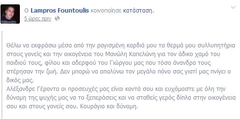 Ένα συγκινητικό μήνυμα έστειλε ο Λάμπρος Φουντούλης, πατέρας του Γιώργου που δολοφονήθηκε την Παρασκευή έξω από τα γραφεία της Χρυσής Αυγής στο Νέο Ηράκλειο, μέσω Facebook στις οικογένειες του Μανώλη Καπελώνη και του Αλέξανδρου Γέροντα.