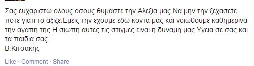Ο Βαγγέλης Κιτσάκης έγραψε πριν λίγες ώρες: “Σας ευχαριστώ όλους όσους θυμάστε την Αλεξία μας. Να μην την ξεχάσετε ποτέ γιατι το άξιζε. Εμείς την έχουμε εδώ κοντά μας και νοιώθουμε καθημερινά την αγάπη της. Η σιωπή αυτές τις στιγμές είναι η δύναμή μας. Υγεία σε σας και τα παιδιά σας”.