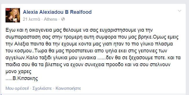 “Εγώ και η οικογένειά μας θέλουμε να σας ευχαριστήσουμε για την συμπαράστασή σας στην τρομερή αυτη συμφορά που μας βρήκε. ‘Ομως εμείς την Αλεξία πάντα θα την έχουμε κοντά μας γιατί ήταν το πιο γλυκό πλάσμα του κόσμου. Τώρα θα μας προστατεύει από ψηλά εκεί στις γειτονιές των αγγέλων. Καλό ταξίδι γλυκιά μου γυναίκα ……δεν θα σε ξεχάσουμε ποτέ και τα παιδιά σου θα τα βλέπεις να εχουν συνέχεια πρόοδο και να σου στέλνουν μόνο χαρές.