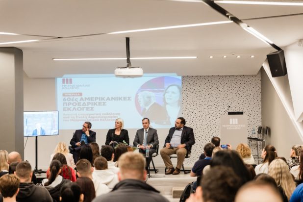 Τις επερχόμενες αμερικανικές εκλογές, τις κρίσιμες πτυχές τους, τις επιπτώσεις στην παγκόσμια πολιτική σκηνή και τη σημασία του αποτελέσματος στις ελληνοαμερικανικές σχέσεις εξέτασε το Μητροπολιτικό Κολλέγιο, το μεγαλύτερο Κολλέγιο Πανεπιστημιακών Σπουδών στην Ελλάδα, σε ημερίδα που διοργάνωσε στο downtown campus. Τη συζήτηση, που συντόνισε η δημοσιογράφος Μαρία Νικόλτσιου, πλαισίωσαν διακεκριμένοι ομιλητές με εξειδίκευση στις διεθνείς σχέσεις, την πολιτική ανάλυση, την επικοινωνία και τη δημοσιογραφία.