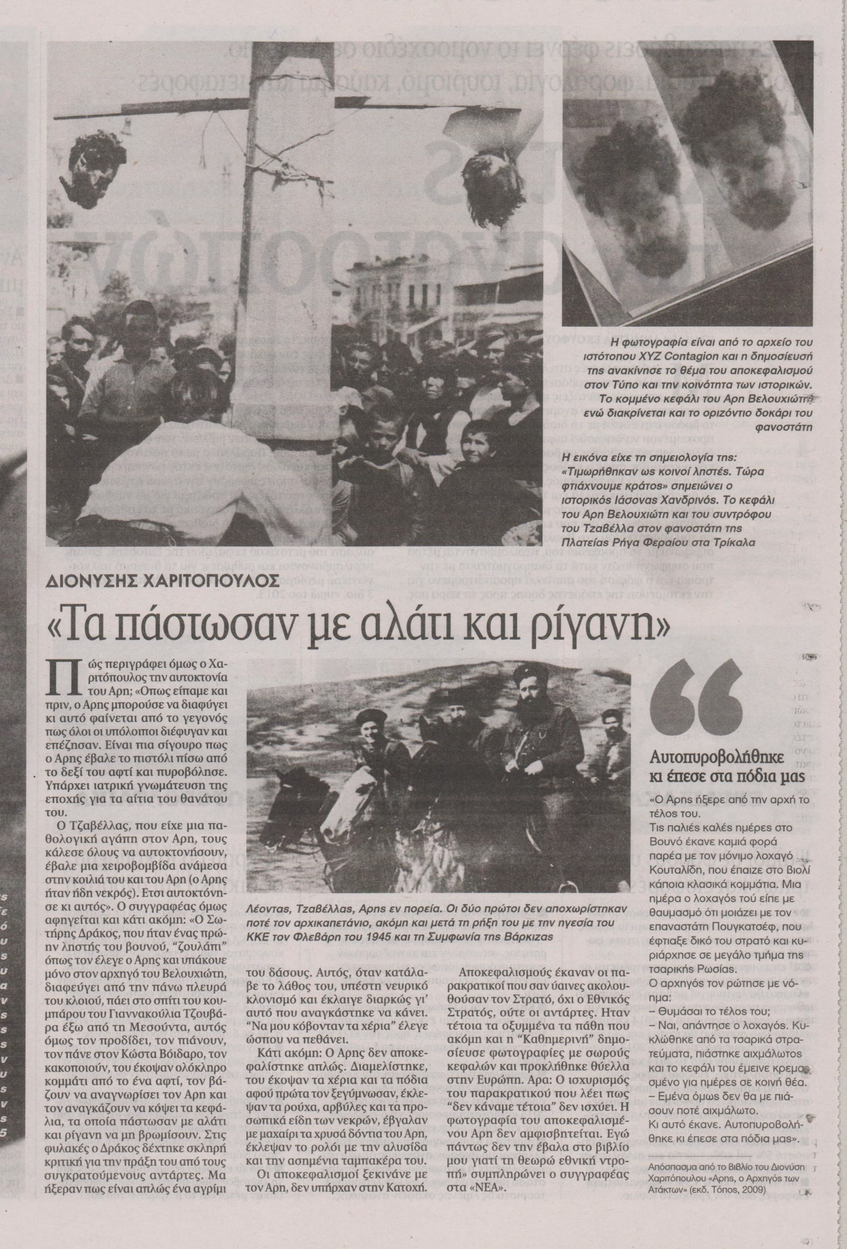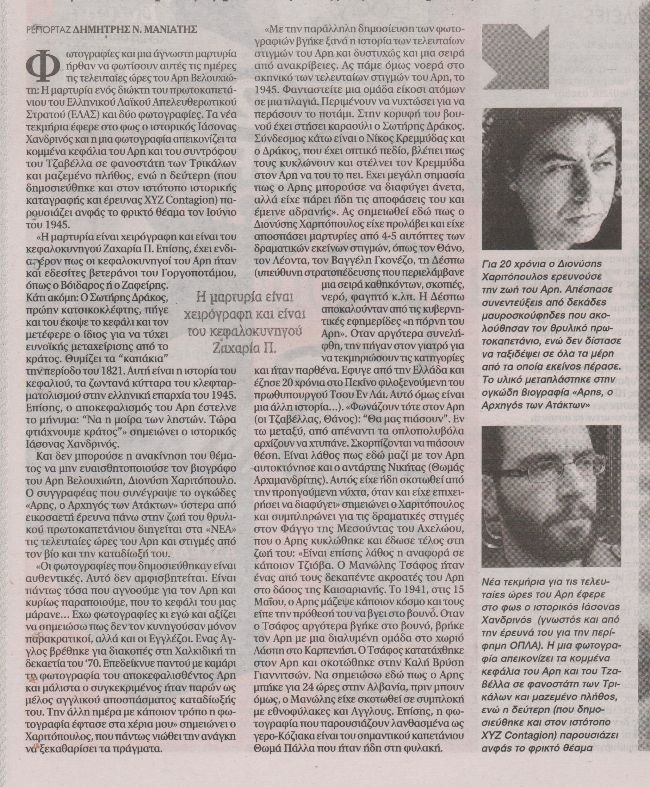 «Οι φωτογραφίες που δημοσιεύθηκαν είναι αυθεντικές. Αυτό δεν αμφισβητείται. Είναι πάντως τόσα που αγνοούμε για τον Άρη και, κυρίως, παραποιούμε, που το κεφάλι του μας μάρανε… Έχω φωτογραφίες κι εγώ και αξίζει να σημειώσω πως δεν τον κυνηγούσαν μόνον παρακρατικοί, αλλά και οι Εγγλέζοι. Ένας Άγγλος βρέθηκε για διακοπές στη Χαλκιδική τη δεκαετία του ’70. Επεδείκνυε παντού με καμάρι τη φωτογραφία του αποκεφαλισθέντος Άρη και μάλιστα ο συγκεκριμένος ήταν παρών ως μέλος αγγλικού αποσπάσματος καταδίωξής του.
