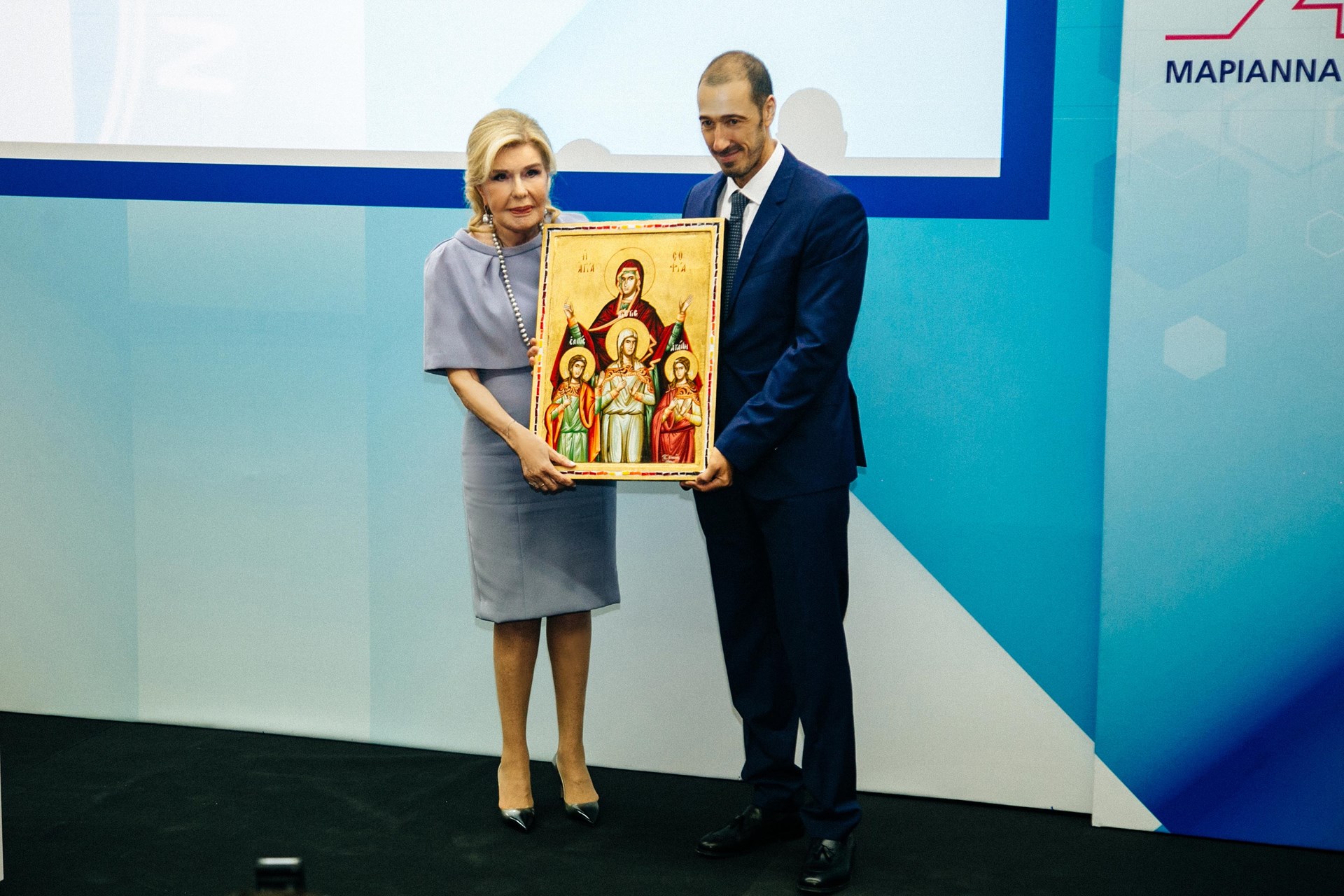 Ο διοικητής του Νοσοκομείου Παίδων “Η Αγία Σοφία” σε μία συμβολική κίνηση παραδίδει στην Μαριάννα Β. Βαρδινογιάννη μια εικόνα της Αγίας Σοφίας