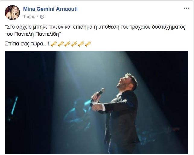 Μετά το πόρισμα του Εισαγγελέα για την υπόθεση Παντελίδη, αποδεικνύεται ότι οδηγός του μοιραίου τζιπ ήταν ο άτυχος τραγουδιστής.Αμέσως μετά τη δημοσιοποίηση του πορίσματος, η Μίνα Αρναούτη, η οποία επέβαινε μαζί με τον τραγουδιστή στο όχημα την ημέρα του δυστυχήματος, μέσω μίας ανάρτησης στον προσωπικό της λογαριασμό στο Facebook, έστειλε ένα οργισμένο μήνυμα σε όσους την επέκριναν και την αμφισβητούσαν όλο αυτό το χρονικό διάστημα.«Στο αρχείο μπήκε πλέον και επίσημα η υπόθεση του τροχαίου δυστυχήματος του Παντελή Παντελίδη… Σπίτια σας τώρα..!», έγραψε χαρακτηριστικά.